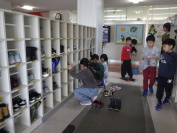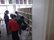 玄関では2年生がくつ箱のそうじをしていました。学校の中の物は